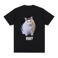 Cat saying huh? funny meme t-shirt made from cotton/polyester broadcloth fabric. Features cartoon pattern with O-neck collar & short sleeves in oversized casual style. Available in 9 colors & 7 European sizes (XS-XXXL) for junior men & women. Breathable printed tee perfect for spring/summer fashion & couples wear with slight stretch.