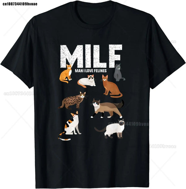 Funny MILF man I love felines t-shirt made from cotton material with stretch fabric. Features humorous cat lovers quote design in hip hop casual style. Available in 9 sizes (S-6XL) with short sleeves for summer wear. Unisex pullover perfect for cat enthusiasts who enjoy witty humor & casual streetwear fashion.