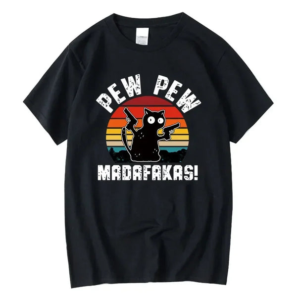 Summer casual men's t-shirt made from 100% cotton broadcloth with knit construction. Features cool funny cat animal print with O-neck collar & short sleeves in loose fit. Available in 5 sizes (S-XXL). Breathable, moisture-wicking & sustainable fabric perfect for casual summer wear. Machine washable for easy care.